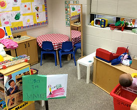 There is only one pre-kindergarten class at Wildwood Elementary and it is located in a small outside building with 4 classrooms total. The students being taught are pre-kindergarten students at Wildwood Elementary. There are 19, 4-5 year old students. The other classrooms in the building are used for special education, gifted students, and time out room. There is a boys and girls bathroom located right outside of our door which allows for an easy, open restroom policy. The children simply ask if they can use the restroom and are given permission to do so. Our classroom is comprised of a common meeting area where three lines are taped on the ground with students names on them. This gives students a spot of their own, however the students are not alway required to sit on these spots. For read alouds, students are able to gather around the teacher for a better view of the book. The students are dismissed for center in a random order using Willabee Wallabee. They are allowed to choose freely which center they will go to and if there are too many students in one cetner, the teacher will direct several students to other centers. The centers in the classroom consist of: dramatic play, music, blocks, science, library, writing, art, sand table, and the playground. Below are pictures of each center and a description of the materials present in the center.